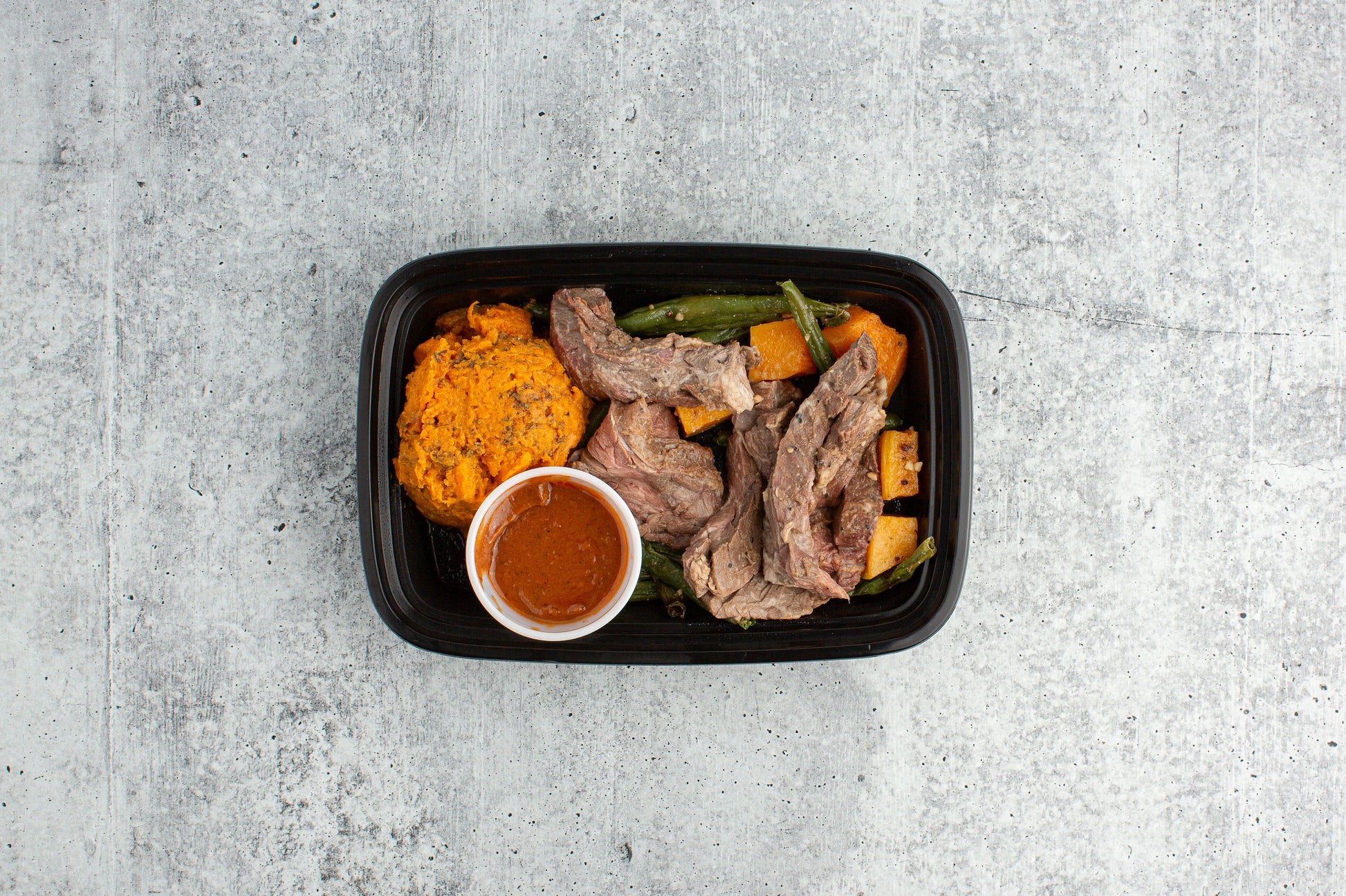 48-Hour Marinated Skirt Steak, green beans, butternut squash, sweet potato mash, house-made A2 steak sauce